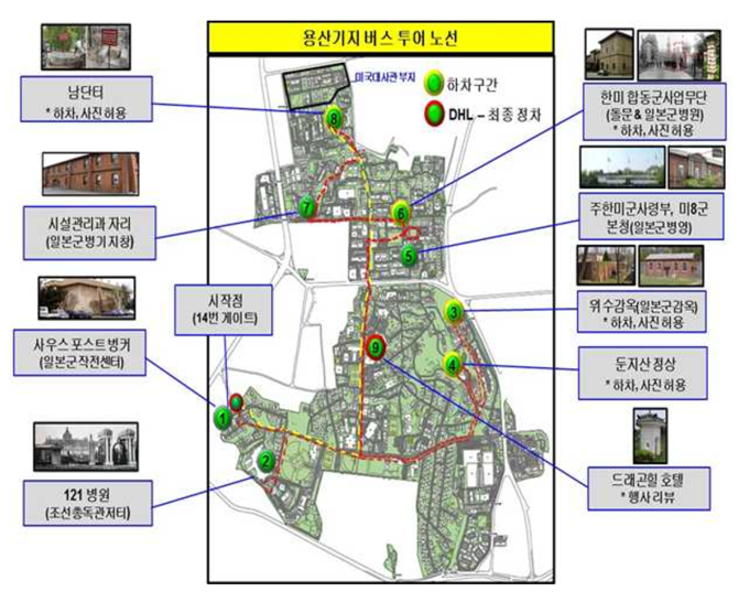 이날 첫 운행을 시작하는 '용산기지 버스투어'는 기지 내 역사적·문화적 유의미한 장소 등을 둘러보면서 주요 거점에 하차해 공원 조성에 대해 의견을 나누는 방식으로 진행된다.