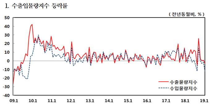 전체 수출물량과 수출 금액이 동반 하락하기는 작년 9월 이후 처음이다. 한은 관계자는 "작년 4분기 대비 올해 1월, 2월 수출이 둔화 흐름"이라면서도 "설 명절 때문에 1, 2월은 변동성이 크다는 점을 고려하면 앞으로 추세가 어떻게 될지는 지켜봐야 할 것"이라고 말했다.