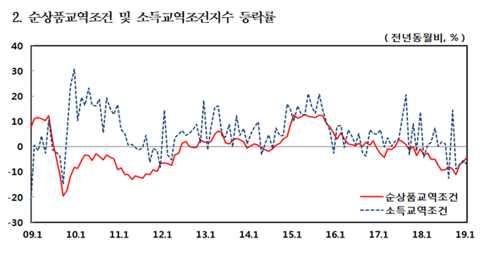 순상품교역조건지수란 상품 1단위를 수출한 대금으로 살 수 있는 수입품의 양을 뜻한다. 이 지수의 하락은 수출가격이 수입가격보다 상대적으로 더 많이 떨어졌음을 의미한다. 순상품교역조건지수는 2017년 12월부터 쭉 내리막이다.
