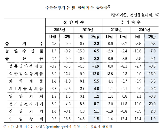 2월 수출 물량·금액 동반 하락