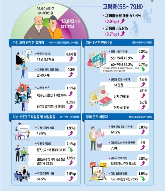 65∼79세 고령층 10명 중 4명은 은퇴하지 않고 여전히 일하는 것으로 나타났다. 장래 근로를 원하는 고령층의 과반은 '생활비 보탬'을 취업희망 동기로 꼽았다.