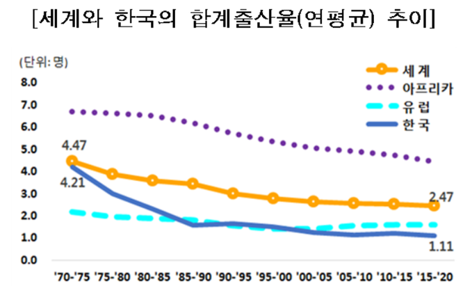 한국은 1970년대만 하더라도 전 세계 평균 수준의 합계출산율을 유지했다. 유엔 통계에 따르면 1970~1974년 전세계 평균 합계출산율은 4.47명이었고, 같은 기간 한국의 합계출산율도 4.21명이었다.