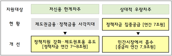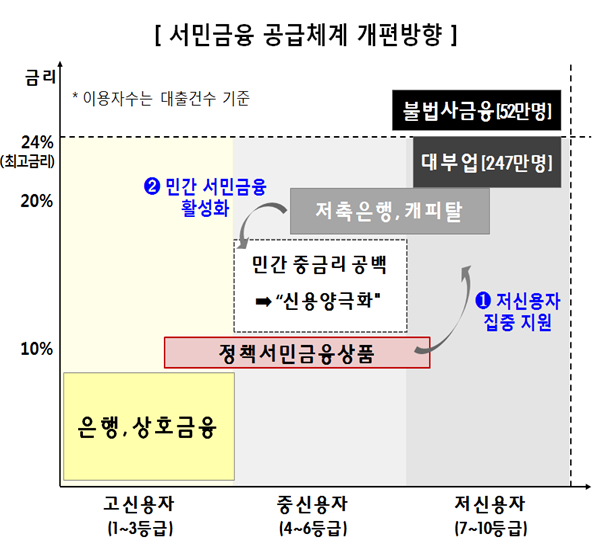 중신용자 대출 비중이 높은 현행 정책금융상품의 금리는 상향 조정된다. 정부는 상대적으로 신용등급이 높은 4~6등급이 금리가 낮은 정책서민자금에 과도하게 의지하면서 시장 왜곡이 발생한다고 봤다.