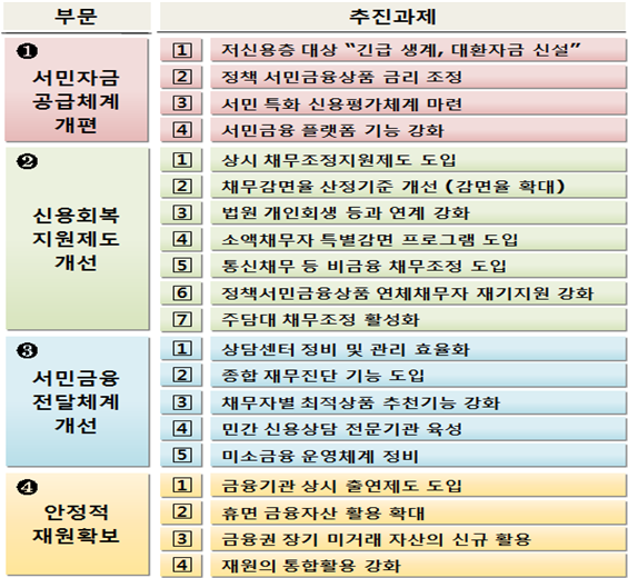 정부는 현재 미소금융(창업·운영자금), 바꿔드림론(고금리→저금리 대환자금), 햇살론(생계자금), 새희망홀씨(생계자금) 등 4대 정책상품을 중심으로 서민대출을 지원 중이다.