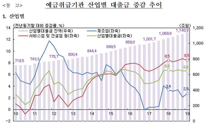 한국은행이 29일 발표한 '2019년 1분기 중 예금취급기관 산업별 대출금'을 보면 3월 말 예금 취급기관의 산업별 대출 잔액은 1140조9000억 원으로 석 달 전보다 19조6000억 원 늘었다.