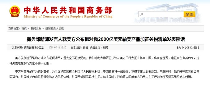 그러나 상무부는 지난 6일 미국이 중국산 제품 340억 달러어치에 관세를 부과할 것을 발표했을 때 즉시 반격에 나선 것과 달리 이날은 구체적인 보복 조치에 대해서는 밝히지 않았다.