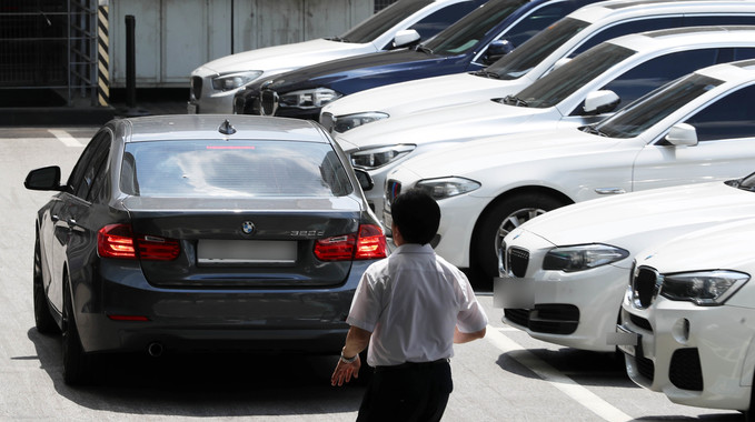 ▲ BMW 리콜 대상 차량에 대한 운행정지 명령이 내려진 가운데 15일 서울 영등포 BMW 서비스센터에서 차량들이 주차돼 있다. [뉴시스]