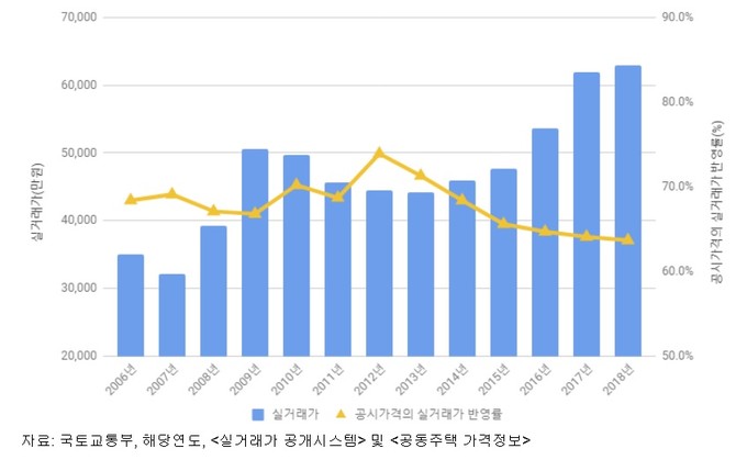 2006년 서울 아파트 평균 실거래가는 3억4989만 원인데 비해 공시가격 실거래가 반영률은 68.4%에 불과했다. 반영률은 2012년 73.9%로 최고점을 기록했지만 이후 집값이 급등하면서 지속적으로 하락했다.