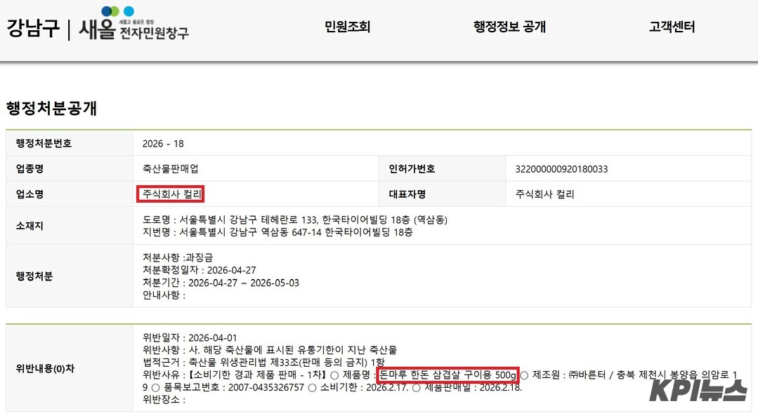 강남구 위생과 관계자는 "컬리가 소비기한이 2026년 2월 17일까지인 해당 제품을 2026년 2월 18일에 판매한 것에 대해 소비자가 민원을 제기했다"며 "축산물판매업자인 컬리가 소비기한이 지난 축산물을 판매했기 때문에 영업정지 7일과 해당제품 폐기 처분을 내렸다"고 말했다.