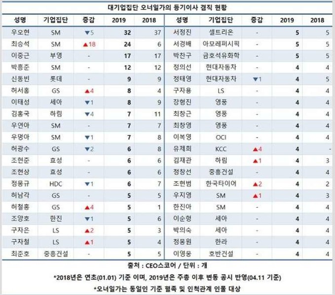 대기업 오너 일가의 직함은 여럿인 경우가 많다. 3명 중 1명은 최소 3개 이상의 계열사 등기이사를 겸직하고 있는 것으로 조사됐다.