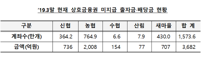 금융당국은 올해 3월 말 기준 상호금융조합에서 탈퇴한 조합원이 찾아가지 않은 출자금 및 배당금 총 1574만 계좌, 3682억 원의 주인을 찾아줄 방침이다.