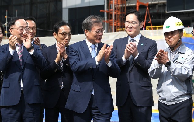 ▲ 문재인 대통령과 이재용 삼성전자 부회장이 지난달 30일 경기 화성 삼성전자 화성사업장에서 열린 시스템반도체 비전 선포식을 마친 후 EUV(극자외선)동 건설현장 앞에서 기념촬영을 하고 있다. [뉴시스]