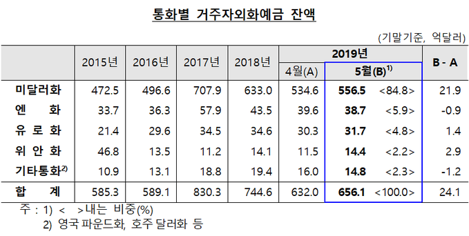 한국은행이 17일 발표한 '5월 중 거주자 외화예금 동향'을 보면 지난달 말 현재 외국환은행의 거주자 외화예금은 656억1000만 달러(약 77조8000억 원)로 한 달 전보다 24억1000만 달러(약 2조9000억 원) 늘었다.
