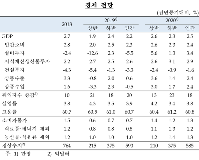 한편 올해 상품수출 증가율은 전년 대비 0.6%로 지난 4월 2.7%에서 크게 하락했다. 같은 기간 설비투자 증가율도 0.4%에서 -5.5%로 크게 줄어들었다. 이는 IT부문 업황 부진과 미·중 무역분쟁에 따른 불확실성이 증대됐기 때문이라는 분석이다.
