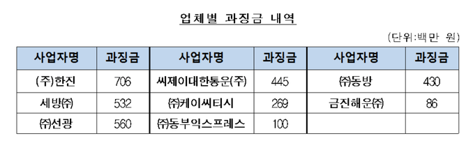 담합 행위를 벌인 물류사는 한진, CJ대한통운, 동방, 셋방, 동부익스프레스, 선광, 케이씨티시 , 금진해운이다. 이들이 참여한 10건의 입찰규모는 총 294억 원이다.