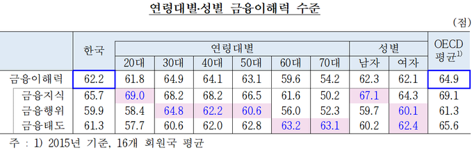 한국은행과 금융감독원이 28일 발표한 '2018 전국민 금융이해력 조사결과'를 보면 우리나라 성인의 금융이해력 점수는 62.2점으로 OECD 평균(64.9점.2015년)보다 낮다.
