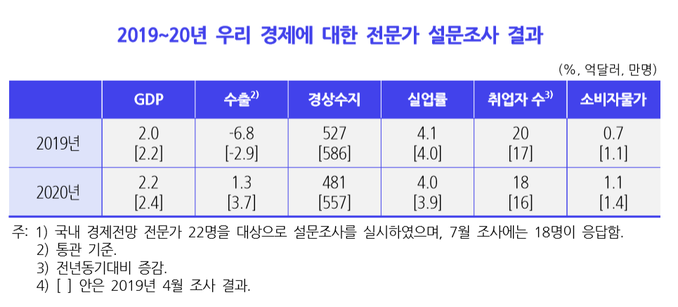 경기 둔화 우려가 커지면서 국내 전문가들도 경제성장률 전망치를 낮췄다. KDI가 7월 국내 경제전망 전문가 18명을 대상으로 올해 경제성장률 전망치를 물은 결과 평균 2%로 집계됐다. 4월 조사 당시 2.2%보다 0.2%포인트 떨어졌다. KDI는 "대내외 수요 위축과 일본 수출규제 등이 반영된 결과"라고 평가했다.