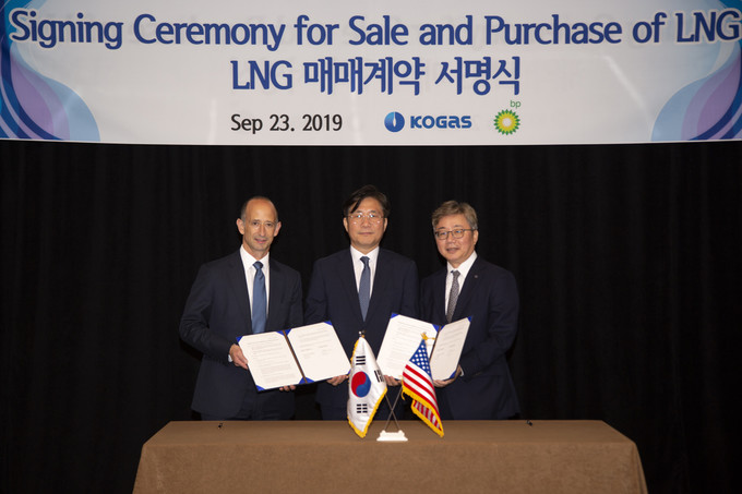 산업통상자원부는 23일 오후(현지시간) 미국 뉴욕 타임스퀘어 호텔에서 한국가스공사와 BP(영국계 석유회사)간 미국산 LNG 도입 계약을 체결했다고 밝혔다. 이 자리에는 방미 중인 성윤모 산업통상자원부 장관도 참석했다.