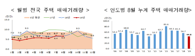 19일 국토교통부에 따르면 지난달 신고된(계약일로부터 60일 이내) 자료 기준 8월 전국 주택 매매거래량은 6만6506건으로 전년 동월보다 0.9% 증가했다. 전월보다는 1.3%, 5년 평균 보다는 22.9% 각각 감소했다.