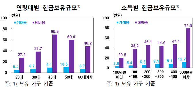 연령대별로 보면 20대의 거래용 보유액이 5만 4000원으로 가장 적었고, 30대(6만 7000원), 60대 이상(6만 7000원), 40대(9만 1000원), 50대(10만 5000원) 순으로 현금 소지액이 늘었다.