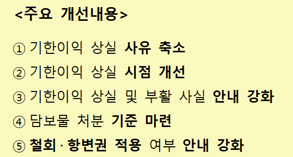 기한이익 상실과 부활에 대한 안내도 강화했다. 압류로 인한 기한이익 상실 시 반드시 채무자에게 사전에 알리고 보증인에게는 상실 후에도 해당 사실을 안내하도록 했다. 담보 제공자에게도 상실 사실을 고지해야 한다.