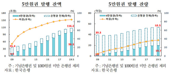 19일 한국은행에 따르면 지난달 말 현재 시중에 유통 중인 5만원권은 98조2000억 원으로 금액 기준으로 전체 은행권(지폐)의 84.6%를 차지했다.