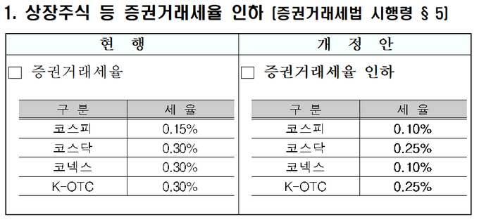 이에 따라 코스피 상장주식에 대한 세율은 기존 0.15%에서 0.10%로, 코스닥 상장주식에 대한 세율은 기존 0.30%에서 0.25%로 0.05%포인트씩 낮아진다. 코넥스는 0.30%에서 0.10%로 세율이 0.2%포인트 내려가고, 한국장외주식시장(K-OTC)는 0.30%에서 0.25%로 세율이 0.05%포인트 인하된다.