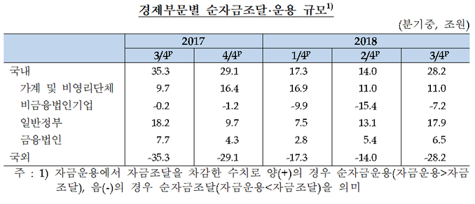 순자금 운용은 경제주체가 예금, 채권, 보험·연금 준비금으로 굴린 돈(자금 운용)에서 금융기관 대출금 등(자금 조달)을 뺀 '여윳돈'이다.