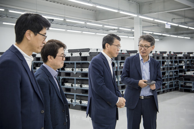 ▲ 은성수 수출입은행장(오른쪽 두번째)이 10일 충북 청주시에 소재한 거래기업 파워로직스를 찾아 김원남 대표(오른쪽 첫번째)의 설명을 듣고 있다.[수출입은행]