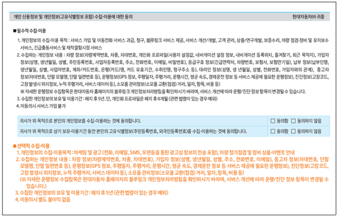 현대차 차량 원격 서비스 블루링크 '개인정보활용동의서'는 위치정보(사용자 설정값, 내비게이션 설정 정보, 내비게이션 등록위치, 즐겨찾기, 최근 목적지)와 운행정보(GPS 정보, 주행일자, 주행거리, 운행시간, 평균 속도, 경제운전 정보)에 대한 이용·수집 동의를 구하고 있다.