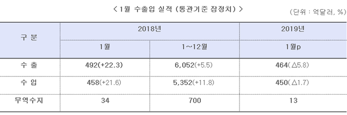 산업부는 "1월 수출은 미중 무역분쟁 등 통상 여건, 반도체 가격과 국제유가 하락 등에 따라 반도체·석유화학·석유제품 중심으로 감소했다"고 설명했다.