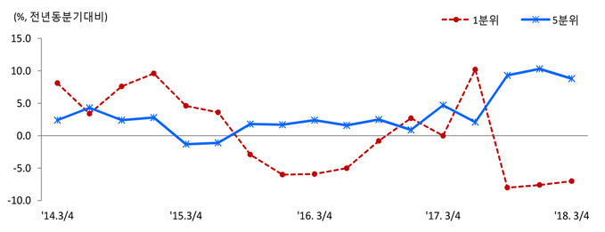 올해 3분기 가계소득 격차가 더욱 벌어졌다는 통계가 나왔다. 저소득층(1분위) 가구당 평균 취업자가 작년보다 16.8% 줄어든 반면 고소득층(5분위) 취업자는 3.4% 증가한 것이 결정적이다.