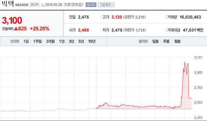 방산주 빅텍은 이날 전일 대비 25.25% 상승한 3100원에 거래를 마쳤다. 빅텍은 북미 정상의 오찬 취소 가능성이 제기된 이후 급등했다.