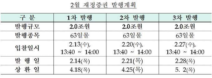 이달 재정증권은 14일, 21일, 28일 각각 2조원 규모로 발행되며 발행 종목은 63일물이다. 재정증권 발행은 통화안정증권(통안증권) 입찰기관(18개), 국고채 전문딜러(17개), 국고금 운용기관(3개)을 대상으로 경쟁입찰 방식으로 진행된다.