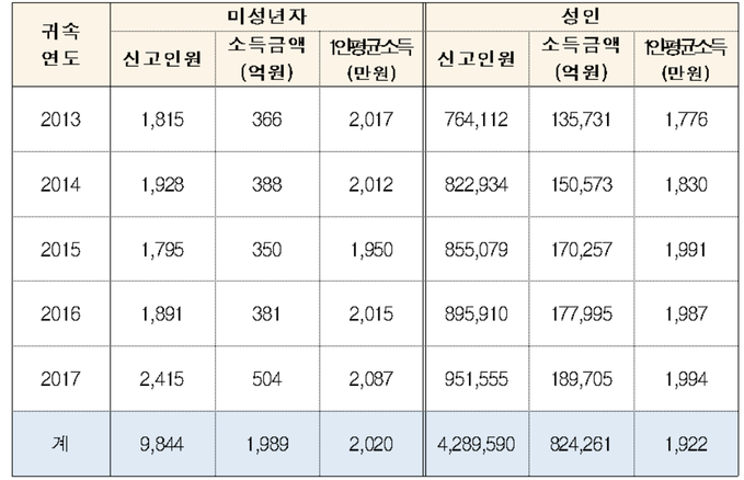 2013년 1815명(366억 원)에서 2016년 1891명(381억 원)에 이르기까지 미성년 임대소득자 인원과 소득액은 소폭의 변화만 보여왔다. 하지만 2017년 들어 처음으로 2000여명을 넘어섰고, 임대소득 또한 단숨에 500억 원대로 올라섰다. 소득금액과 인원이 30%가량 증가한 것이다.