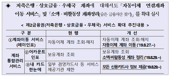 29일 오전 9시부터는 소액·비활동성 계좌 정리(숨은 금융자산 찾기) 서비스도 시행에 들어간다. 잔액이 50만 원 이하고, 1년 넘게 거래가 없는 소액·비활동성 계좌는 계좌이동 서비스와 마찬가지 방법으로 직접 해지 또는 잔고 이전이 가능해진다. 계좌 잔액은 본인 명의 다른 계좌(은행 포함)로 이전할 수 있고, 서민금융진흥원에 기부할 수도 있다.