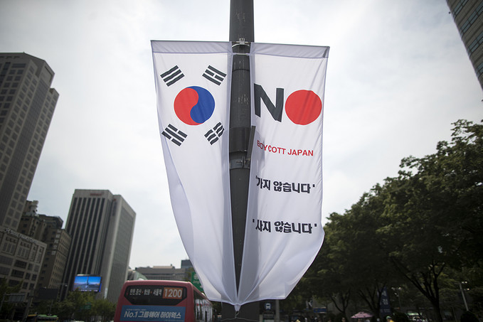 ▲ 지난 6일 오후 서울 중구 세종대로에 태극기와 '노 재팬' 배너기가 설치되어 있다. [정병혁 기자]