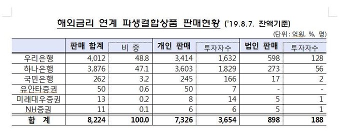이들 DLF·DLS는 우리은행이 4012억 원으로 가장 많이 팔았고, 하나은행 3876억 원, 국민은행 252억 원, 유안타증권 50억 원, 미래에셋대우 13억 원, NH투자증권 11억 원이다.