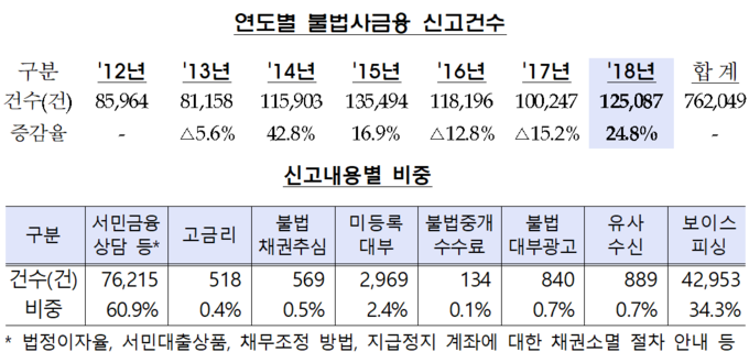 금융감독원은 불법사금융피해 신고센터로 지난해 연간 12만5087건이 접수됐다고 12일 밝혔다. 이는 전년 대비 24.8% 늘어난 규모다.