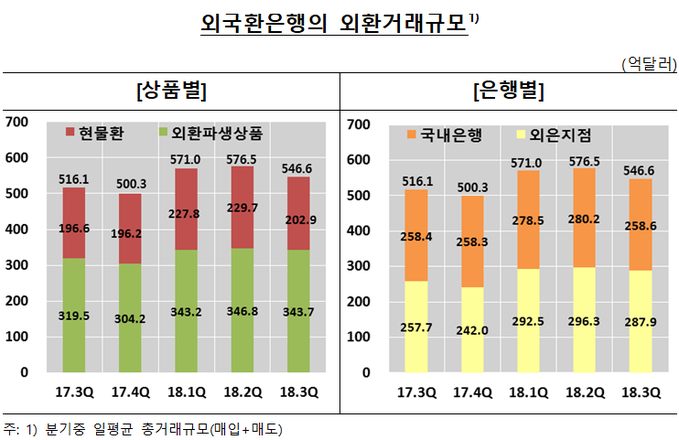 24일 한국은행이 발표한 '외국환은행의 외환거래 동향'에 따르면 3분기중 일평균 외환거래 규모는 546억6000만 달러로 전분기보다 29억9000만 달러(-5.2%) 감소했다.