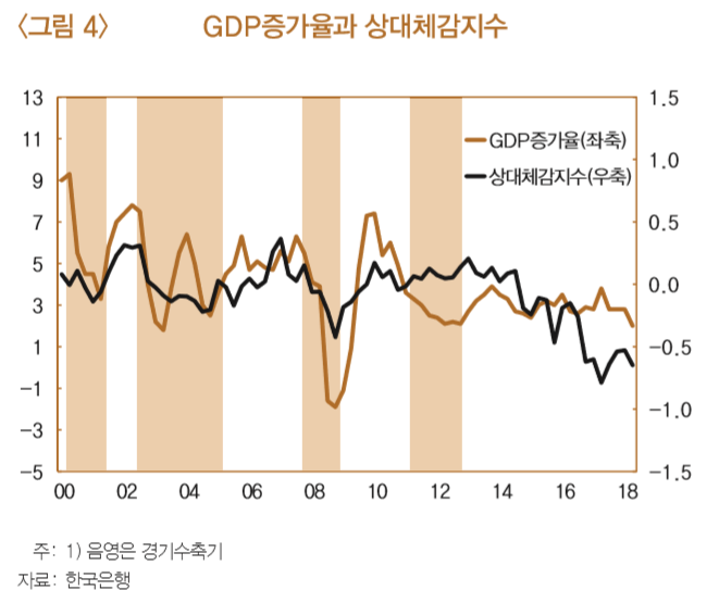 한국은행 김형석 차장과 심연정 조사역은 11일 한은 조사통계월보 1월호에 실린 '경제 내 상대적 격차에 따른 체감경기 분석'에서 "국내총생산(GDP) 증가율은 2014년 이후에도 비교적 좁은 범위에서 안정적으로 움직였으나 상대체감지수는 지속해서 하락했다"고 밝혔다.