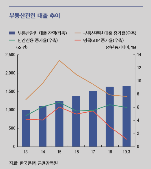 가계의 부동산대출 잔액은 1002조원이며 기업부문에 대한 대출은 667조원이다. 부동산관련 대출에는 부동산담보대출, 집단대출, 전세자금대출, 부동산 프로젝트파이낸싱(PF)대출 등이 포함된다.