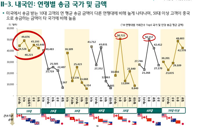 수취인이 10대(고등학생 이하)인 경우 체류 국가별 송금액은 미국 4만9000 달러, 호주 4만5000 달러, 캐나다 4만5000 달러, 영국 4만2000 달러, 뉴질랜드 4만 달러 순이다. 20대(대학생 이상)는 미국 4만 달러, 영국 2만5000 달러, 캐나다 2만4000 달러, 호주 2만2000 달러, 일본 7000 달러 순이다.