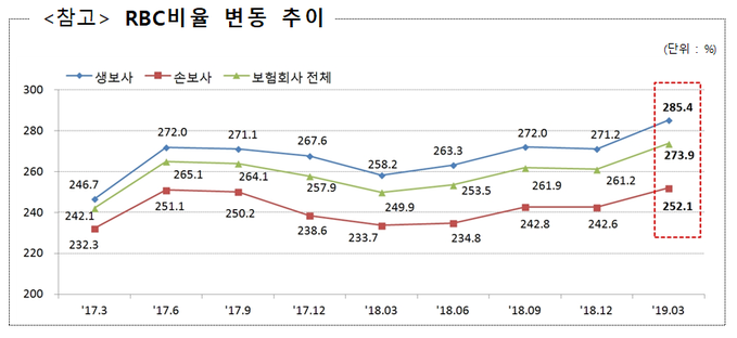금감원 관계자는 "보험업계 새 회계기준(IFRS17)에 대비한 RBC 제도 개선의 영향으로 한때 230%까지 내려갔으나 이후 조금씩 상승했다"고 설명했다.
