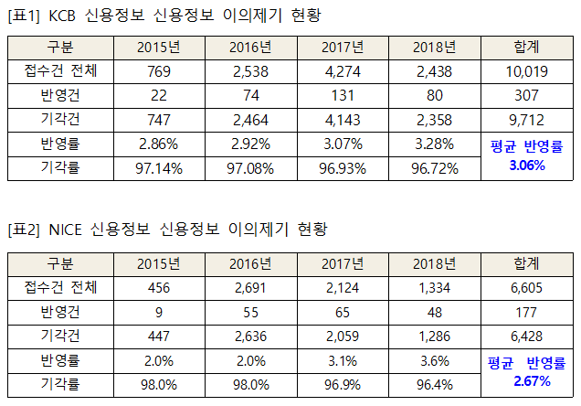 3년간 이의제기 반영률, KCB 3.05% NICE 2.67%