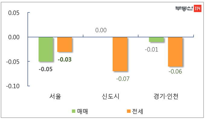 신도시는 △동탄(-0.33%) △평촌(-0.13%) △분당(-0.05%) △광교(-0.02%) △일산(-0.01%) △중동(-0.01%) 순으로 하락했다.