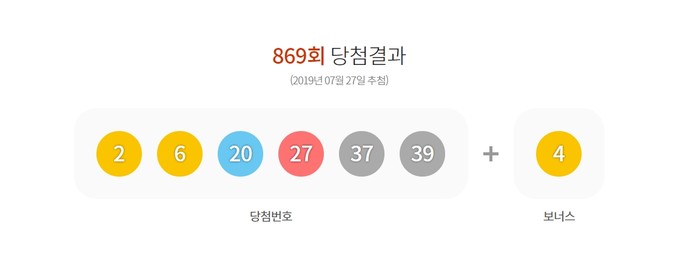 27일 로또 수탁업체 동행복권은 복권통합포털을 통해 제869회 로또복권 당첨번호를 공개했다. 이날 발표된 1등 당첨번호는 2, 6, 20, 27, 37, 39며 2등 보너스번호는 4다.
