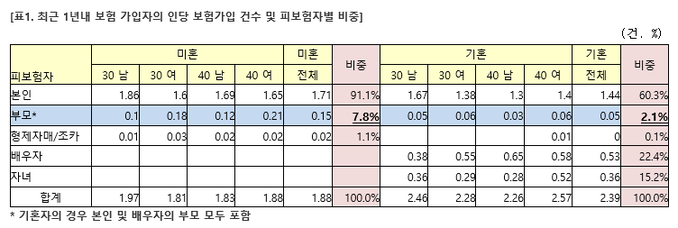 특이한 점은 부모를 피보험자로 하는 보험건수 비중이 7.8%로 기혼자(2.1%)에 비해 4배 가까이 많다는 점이다. 연구소는 미혼자들이 홀로 부모를 돌봐야 한다는 부담을 완화하기 위해 '부모 보험'에 더 관심을 가졌다고 해석했다.