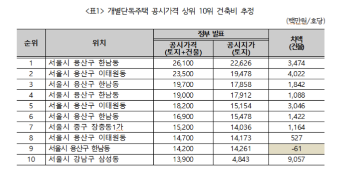 경제정의실천시민연합(경실련)은 정부 발표 기준 올해 최고가 단독주택 70곳의 공시가격(땅값+건물값)과 공시지가(땅값)를 비교한 결과 절반 이상이 공시가격에 건물값이 제대로 반영되지 않고 있다고 11일 밝혔다.