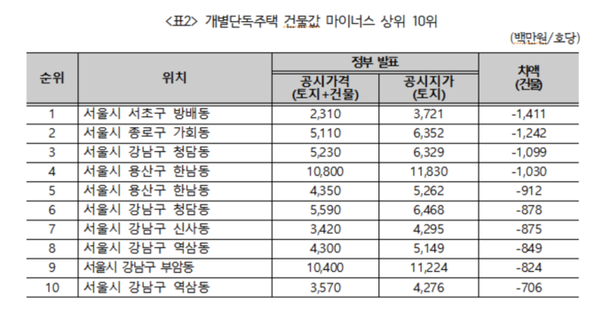 분석대상 중 27곳은 공시가격이 공시지가보다 낮아 건물의 가치가 ‘마이너스(-)’로 나타났다. 서초구 방배동의 한 단독주택의 경우 공시가격이 23억1000만원인데 공시지가는 37억2100만원이어서 마이너스 값이 14억1100만원으로 가장 크게 나왔다.